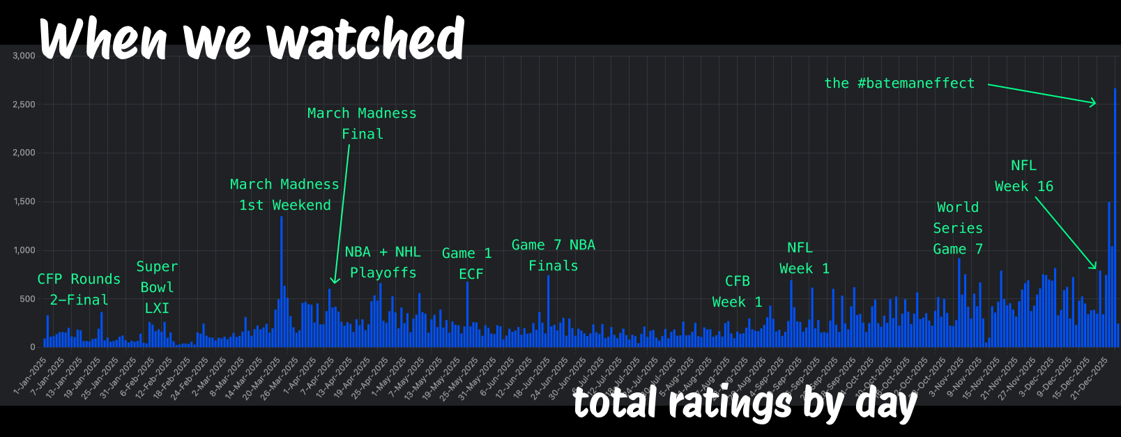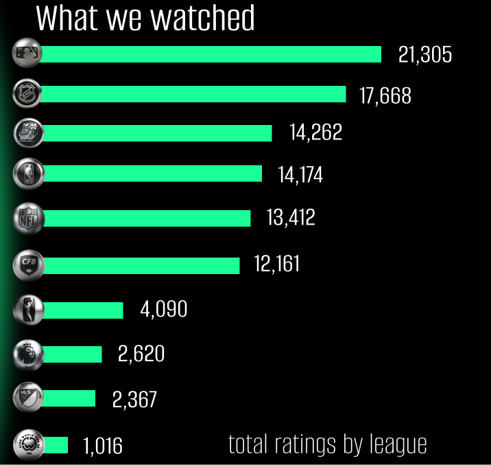 That said, it would be downright naughty-list of me to not point out an important caveat: MLB, MLS, and the WNBA are the only major leagues whose seasons begin and end within the calendar year. The league currently leading the clubhouse in most ratings also happens to play the most games.