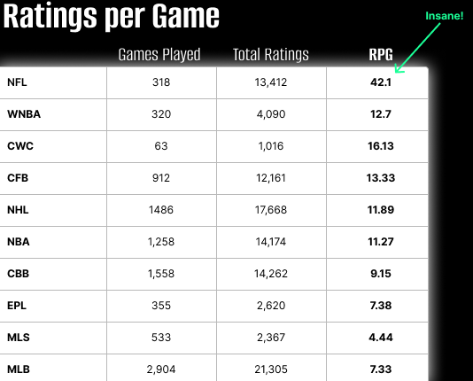 At over 42 ratings per game, the NFL generates nearly 3x that of the next closest league. And that runnerup - the FIFA Club World Cup - isn't even a league at all. It's a short, high stakes tournament. That contrast should tell you everything you need to know. If you're wanting more, I drew a green arrow and wrote "insane", hope that helps.