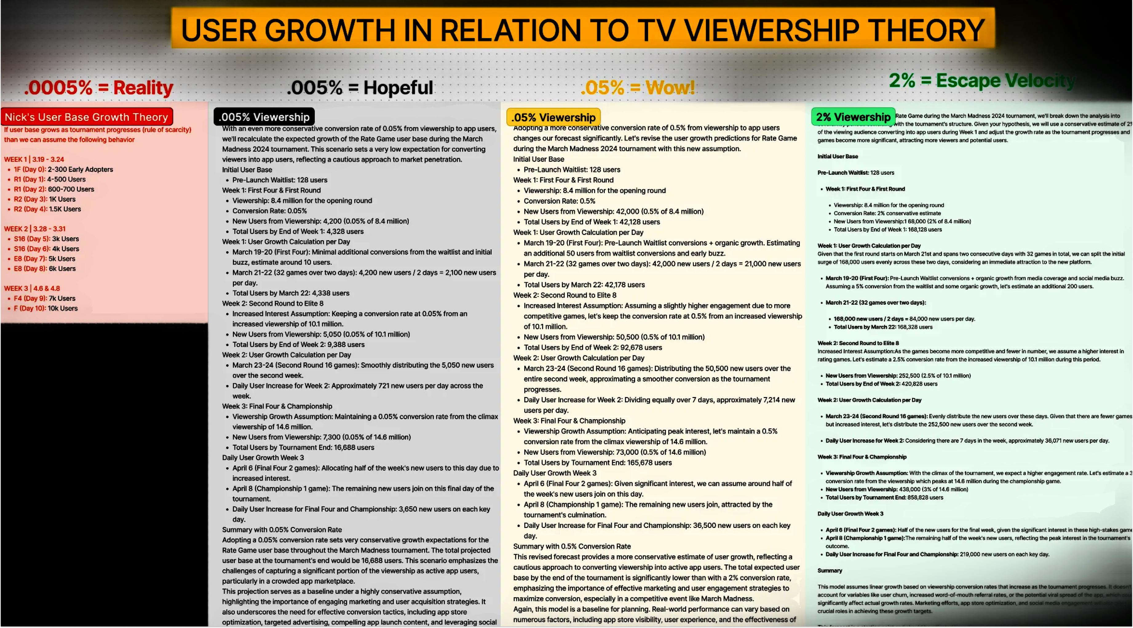 In the early days of RateGame - circa February 2024 - when it was a figment of my Figma imagination (a Figmation if you will), I fashioned myself a theory. As you can see below, I called it "USER GROWTH IN RELATION TO TV VIEWERSHIP THEORY." No clue why caps lock was on - I guess for effect? Whatever. Point is, I guessed. I thought, cogently, that if RateGame managed to capture a measly 2% of the TV viewership audience for March Madness, in just 10 days of basketball games, the idea that was not yet an app would have over 858,000 users and 15 million ratings.